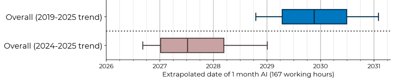 More importantly though, if your mid 2039 result is referring to 50% @ 167 hours, that would be surprising! If our results were this sensitive to task privacy then I think we would need to rethink our task suite and analysis. For context, in appendix D of the paper we do a few different methodological ablations, and I don't think any produced results as far off from our mainline methodology as 2039.