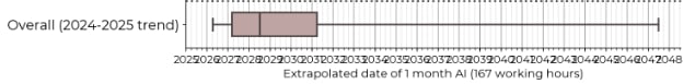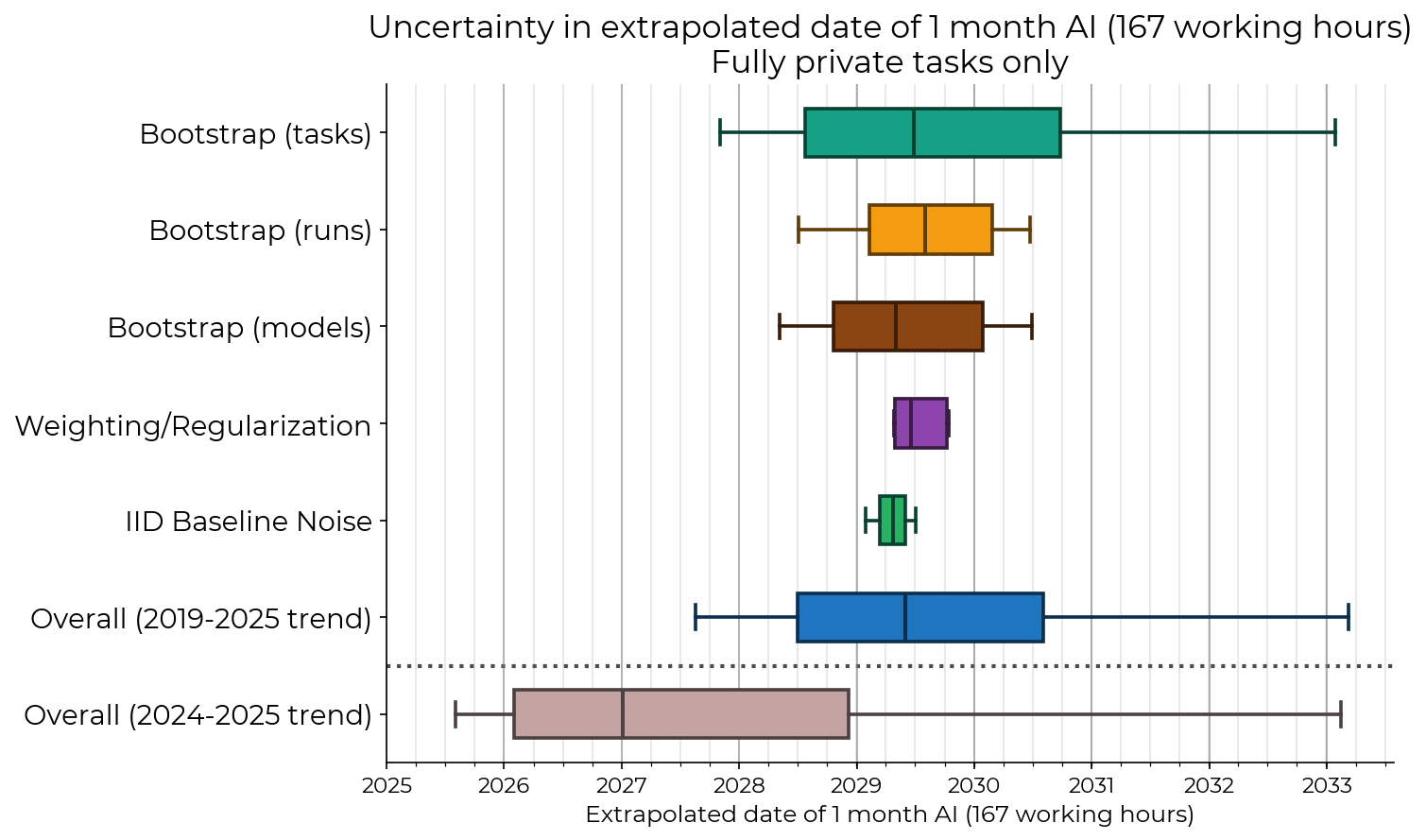 With only fully_private tasks and SWAA and RE-Bench, the extrapolated date of 1-month AI looks similar to the main paper, but the error bars are much larger; this is entirely driven by the small number of tasks (green bar).