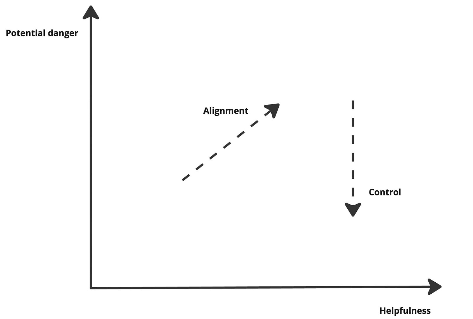 Now, suppose we can solve alignment and average-case control. In that case, we can release models that are controlled against harmful behavior while remaining fine-tunable to any harmless distribution of our choice. This is why alignment and control are complementary in the ideal scenario. Yet, given the current race, I believe our priority should first be on control rather than alignment. Alignment advances us closer to useful/helpful agents by allowing fine-tuning to useful distributions. Control, however, does not bring us closer or further from capabilities, rather, it protects what we can do with the model. In a 2D plane where usefulness/helpfulness and potential danger are the two orthogonal components, alignment would be a vector that has non-zero components in both directions, and control would be a vector virtually orthogonal to the helpfulness direction. This is detailed in the plot below.