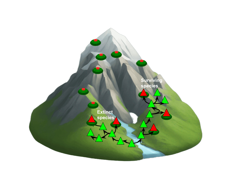 These dangers can be visualized as “landmines” (leading to species extinction) and “traps” (ensnaring species on suboptimal fitness peaks). Importantly, landmines are not found only in the “valleys” of the fitness landscape but also around the very “hills” that seem advantageous at first. In other words, natural selection can unwittingly guide a species to climb a peak that later causes its demise—potentially explaining why the average lifespan of a species is only a few million years.