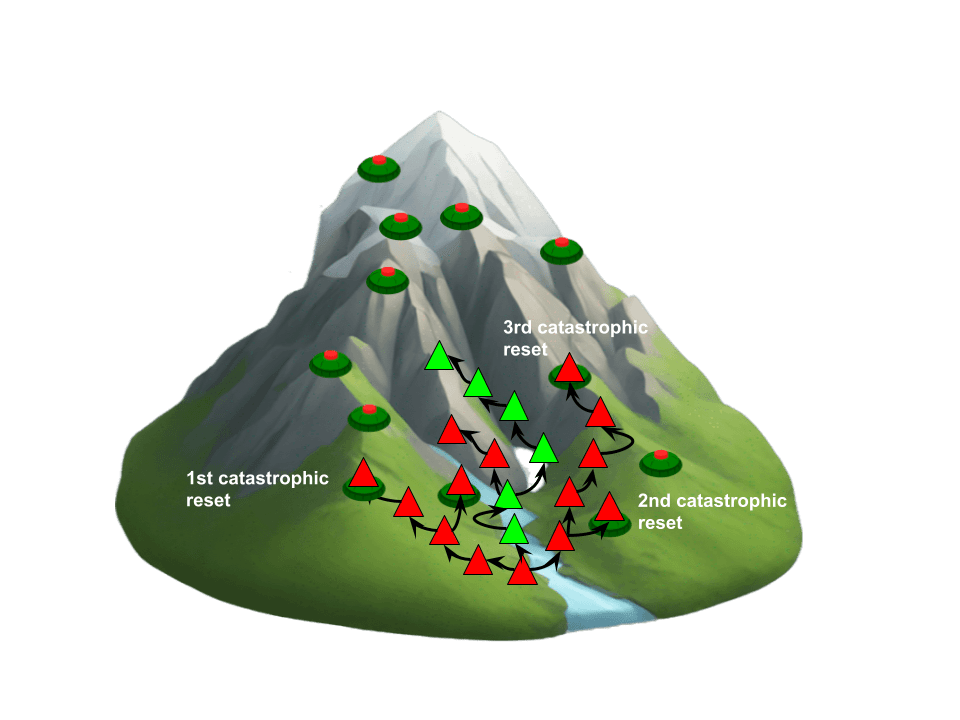 But here’s the interesting part: evolution doesn’t get to see the entire map. It is a blind watchmaker. It doesn’t know where the next mountain peak might be, nor can it foresee an impending drop into a valley. All it does is take one step at a time, test the new terrain, and keep the changes that happen to work better than whatever came before. In effect, each species’ journey across the fitness landscape looks like a random walk—a blind, incremental exploration of what might lead to more offspring.