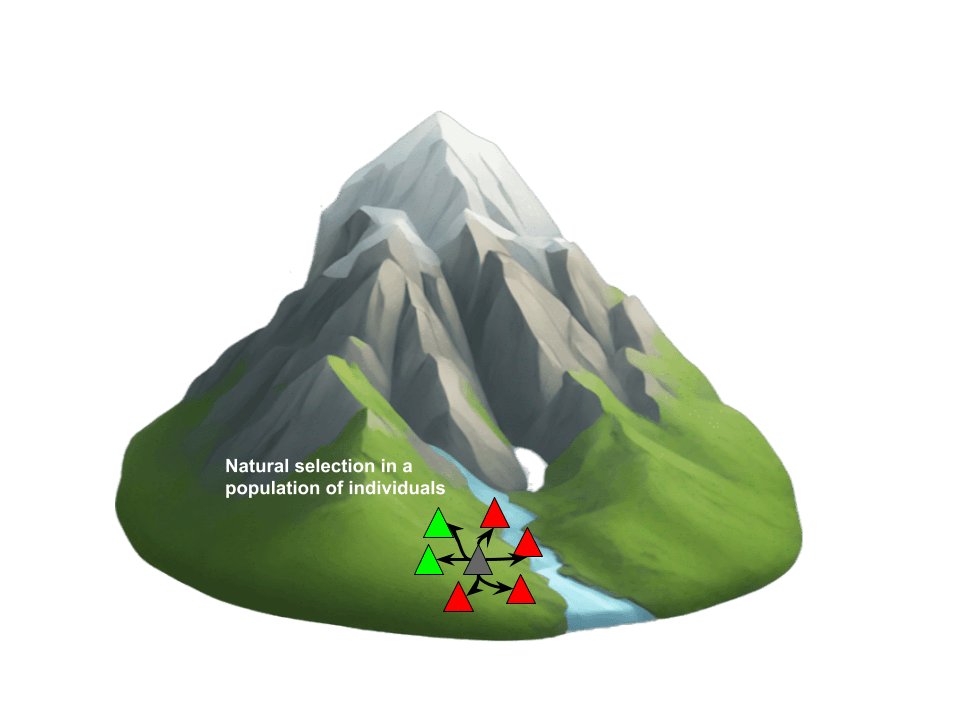 Imagine a group of individuals each taking a small step in a different direction on the landscape. Most of these new paths will lead nowhere special—many might wander straight into a valley of lower fitness, where individuals eventually die off or fail to leave many offspring. But from time to time, a single step hits higher ground, granting an advantage that can spread through the population over generations. Although many individuals perish, the overall fitness of the group (as a whole) can still climb upward, thanks to the incremental success of beneficial changes.