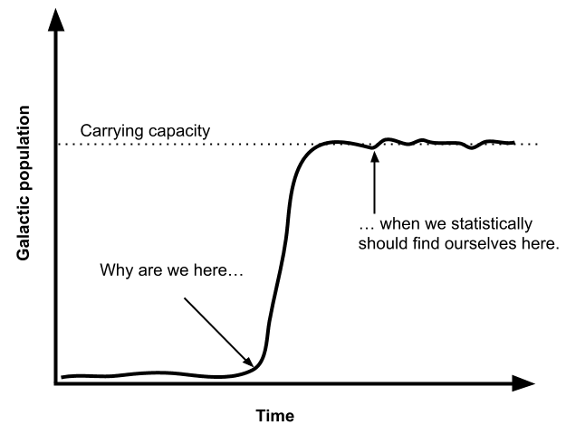 By all rights, if we consider an S-curve of civilization growth, it seems far more likely that we’d be born when humanity (or its successors) is already spread across the galaxy in stable prosperity. That scenario would have a vastly larger population base, so purely from an anthropic perspective—where you’re statistically more likely to be born into a large population than a small one—you might expect to wake up in an era of 10^40 of sapient individuals in the galaxy. Instead, here we are in the infancy of spaceflight, still squabbling on a single planet with 10^10 individuals. If you naively divide those two numbers you would end up with a 0.0000000000000000000000000001% likelihood to find ourselves in the situation we find ourselves in.