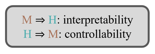 In this most recent talk, Been Kim further stated that the direction going from M to H is what we would call “interpretability”, whereas the opposite goal of bringing the machine’s representation closer to a human understanding would be better called “controllability”, the most famous examples being the alignment problem and safety alignment problems.