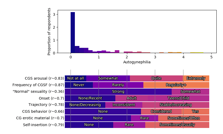 refers to my understanding of how autogynephilia works, and is essentially a factor model which is not literally the same as my statistical models (since statistical data needs to be taken with a grain of salt, and because I also have additional grounding knowledge not included in the statistical model), but which is conceptually very similar to my statistical models like this one: