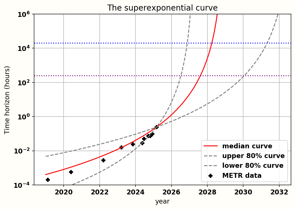 This objection is largely that there are only 11 data points (there are now a few more) on the METR curve, and you can fit it with curves that look essentially the same now but give radically different future outcomes. And yes, I agree, that is kind of the point, and if anything we are underrepresenting the uncertainty here, we can agree that even if we commit to using fully simplified and fully best-fit-to-the-past models we get a range of outcomes that prominently include 2028-2029 SCs.