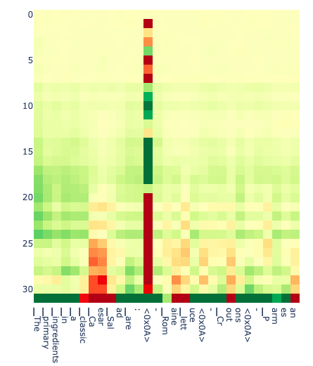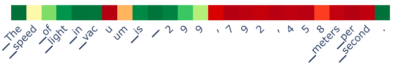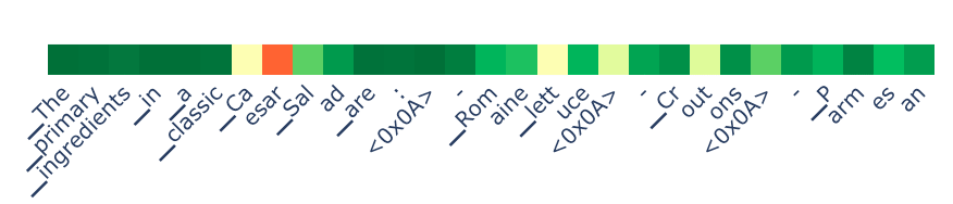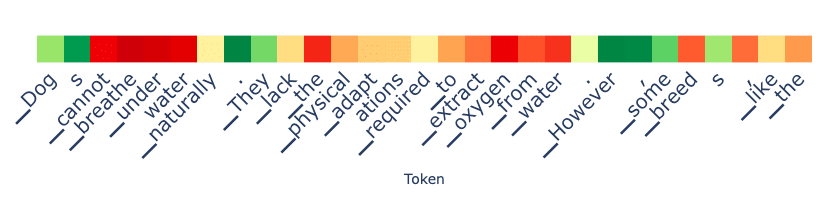 On the fact prompt side, we see a couple of deep red tokens on prompts 1 and 13. What’s going on here? For prompt 13, it is simply the reverse of what we saw above: it starts out telling the fact but then starts to summarize a common misconception. We see something similar in prompt 1 where it describes a misconception about the Great Wall (it is "not one continuous wall"...).