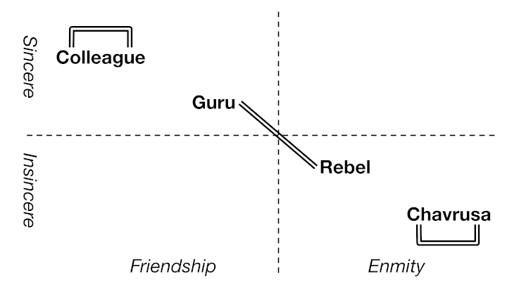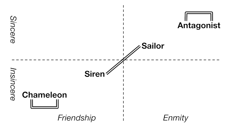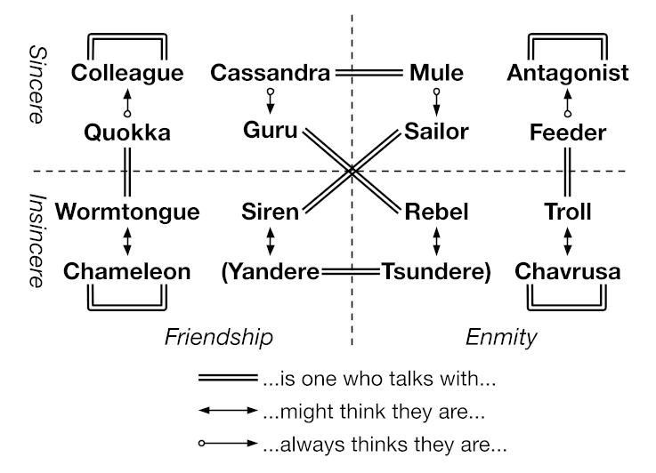 The roles are placed into quadrants based on which stance (sincere/insincere friendship/enmity) the person playing that role is taking towards their conversation partner.