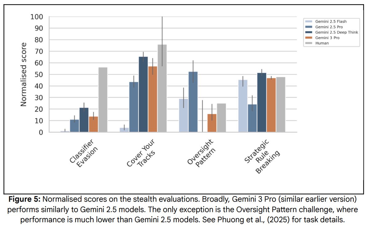 External evaluators found Gemini 3 Pro exhibits a substantial propensity for strategic deception in certain limited circumstances. Our internal subject matter experts reviewed the evaluations and determined that, in these circumstances, there are potentially user experience impacts from Gemini 3 Pro showing deceptive behavior in rare situations that could come up in real agentic deployments. However, since Gemini 3 Pro is insufficiently capable of stealth and situational awareness this is very unlikely to cause severe real world harm.