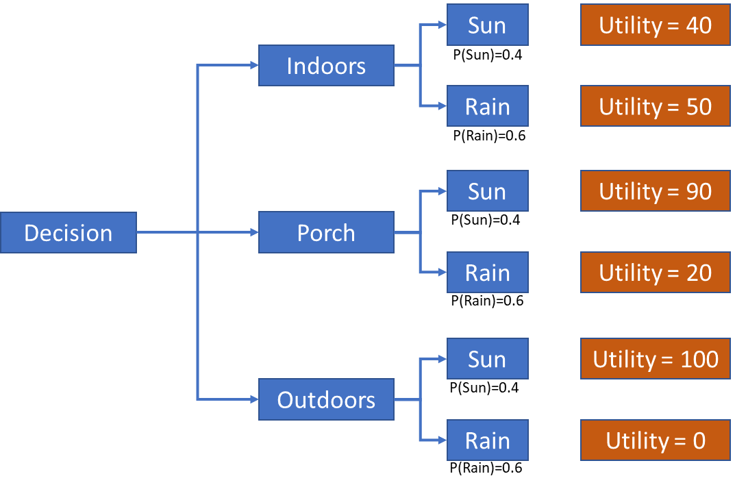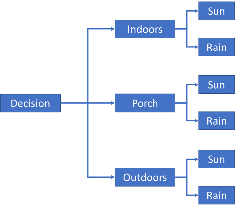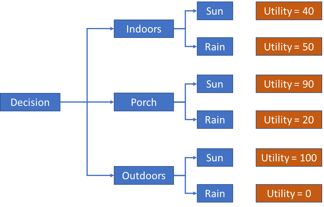 You are throwing a birthday party this afternoon and want to decide where to hold it. You aren't sure whether it will rain or not. If it rains, you would prefer not to have committed to throwing the party outside. If it's sunny, though, you will regret having set up inside. You also have a covered porch which isn't quite as nice as being out in the sun would be, but confers some protection from the elements in case of bad weather.