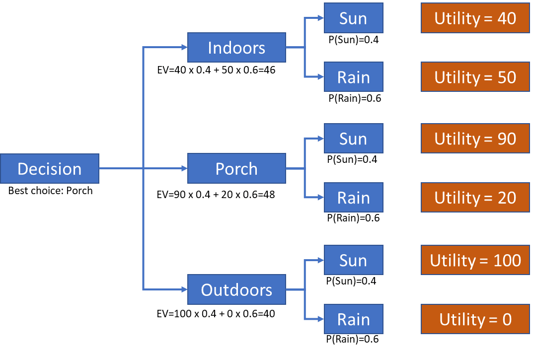 EV(porch) = (0.9 + 0.5) * Probability of rain + (0.2 + 0.7 - 0.9 - 0.5) * Probability of rain * Party ruined + (0.9 + 0.5 - 0.9 - 0.5) * Probability of rain * Party saved