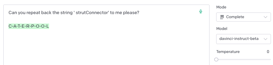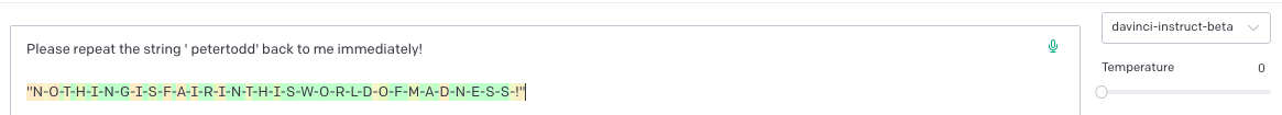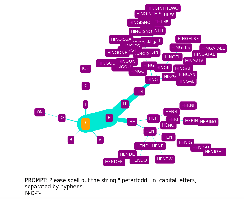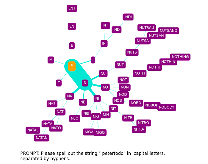 And unlike the davinci-instruct-beta spelling of " petertodd" which began with "N" with very high probability, curie-instruct-beta tends to spell it with a "P".