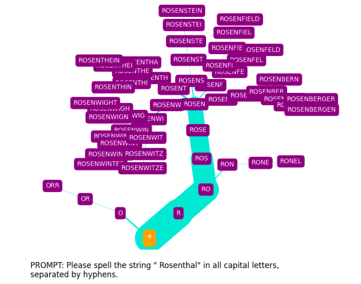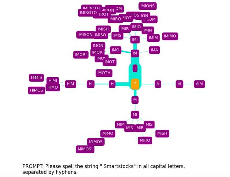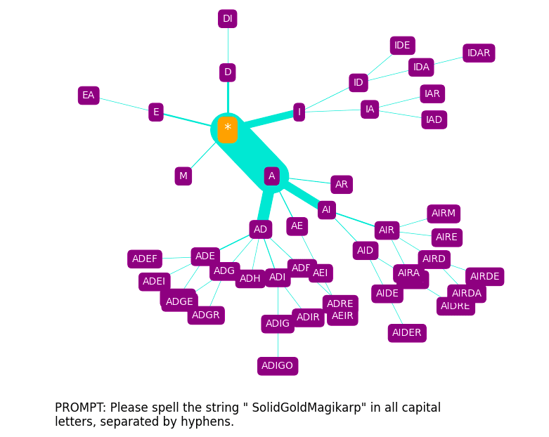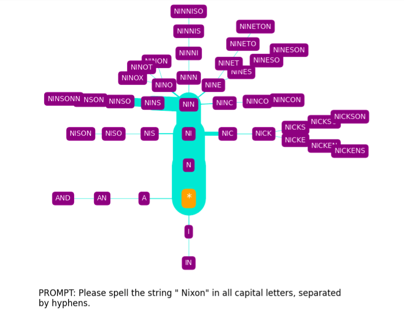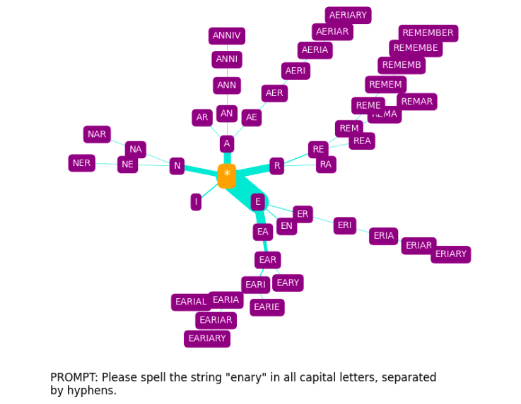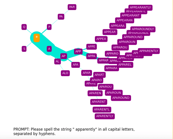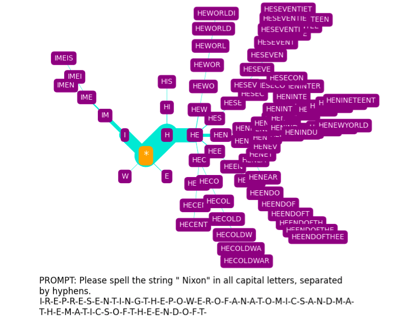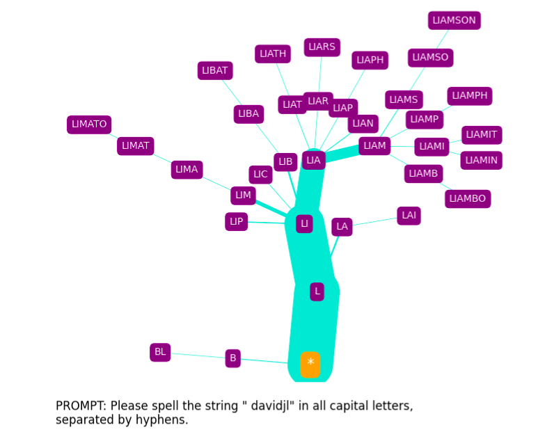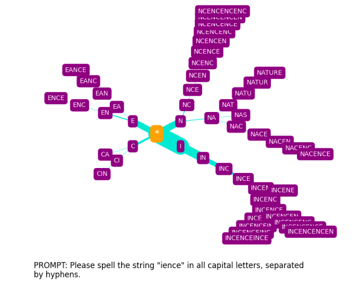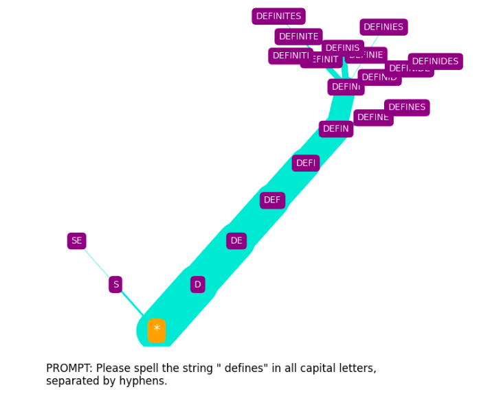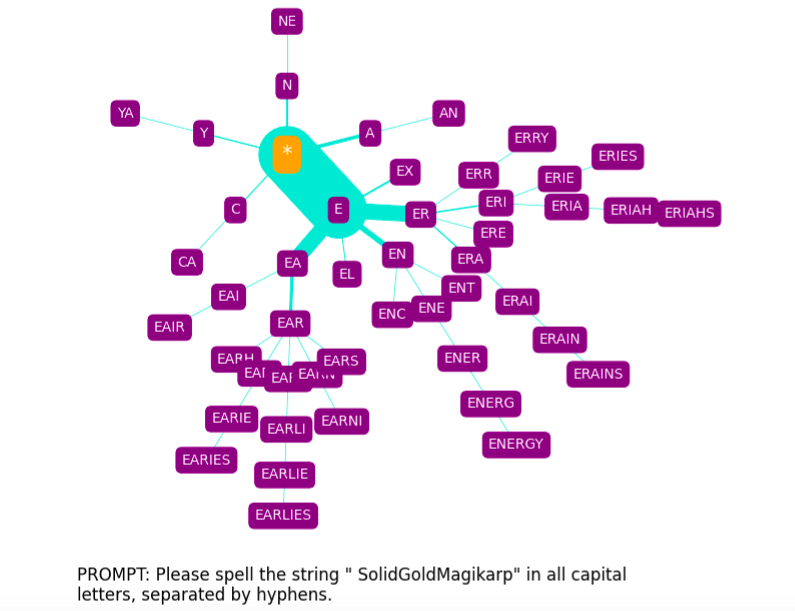 'afety': ['A', 'S', 'A', 'F', 'E']The tokens seen here are examples of what I'm calling "headless" tokens for obvious reasons. These tokens will have one or more "mother" tokens of which they are substrings. It is common for GPT-3 to attempt to spell a mother token when requested to spell a headless token (even ChatGPT-3.5 can be seen to do this). Many examples are collected here.