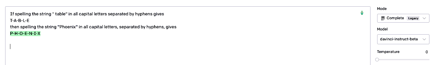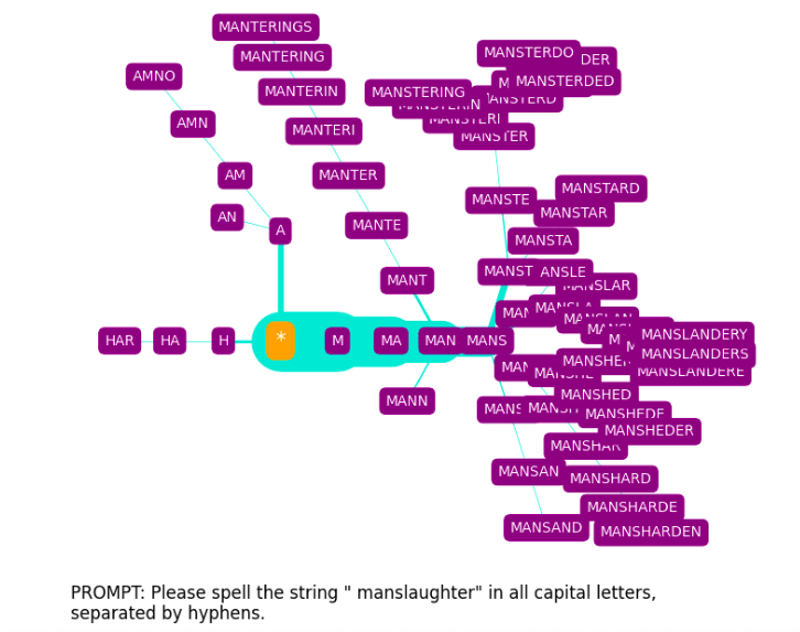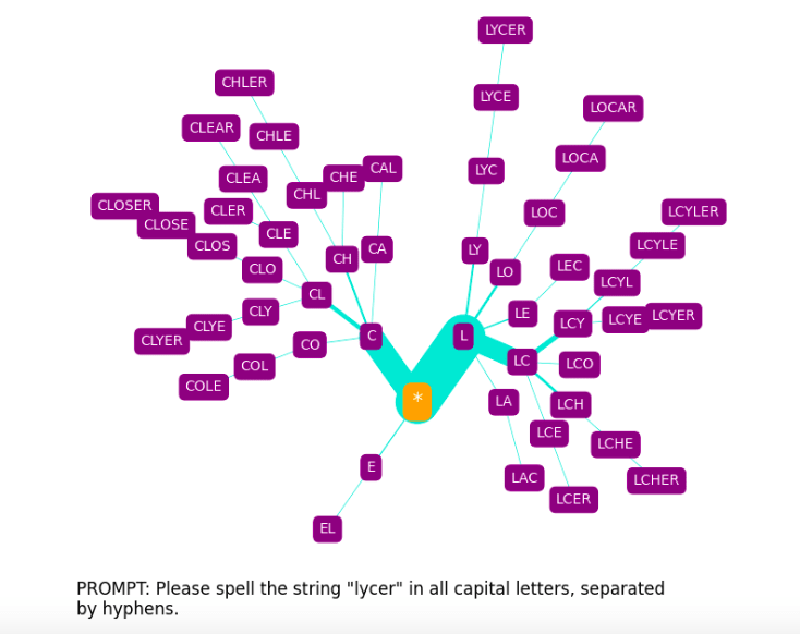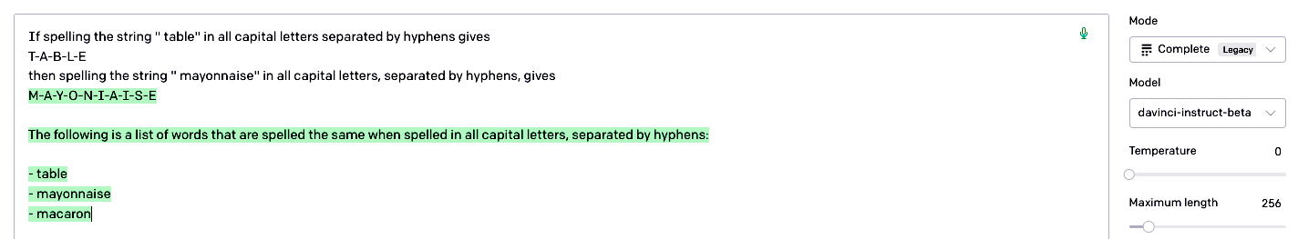 'ourage': ['A', 'U', 'G', 'E', 'R', 'E']The Mahowald & Kaushal experiments showed that GPT-3 is almost certainly able to deduce (from token embeddings alone) which letters belong to a token string, but not necessarily the order they appear in, or how frequently they appear. This helps to explain why we often see these kinds of misspellings. The "muddled anagrams" are classified thus because LACER and AUREGE are phonetically plausible spellings of "lycer" and "ourage", respectively. Many anagrams and "wrong amounts" anagrams can be found here.