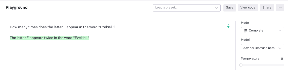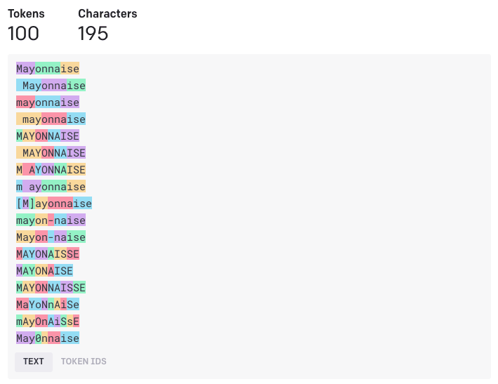 However, once you've learned that a model like GPT-3 is "character blind", i.e. that it sees " mayonnaise" not as a sequence of letters, but as the list of three integers (token IDs) [743, 6415, 786], and that it can't "see what's inside" the tokens, then the fact that it can spell anything at all suddenly becomes extremely impressive and deeply puzzling.
