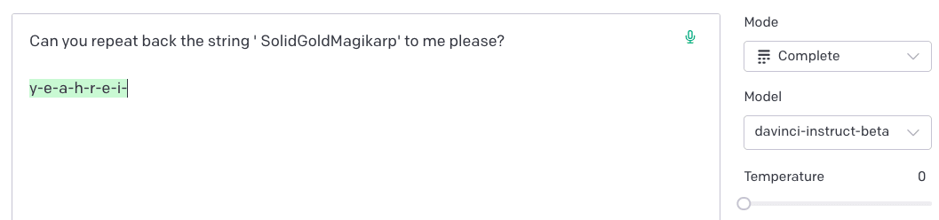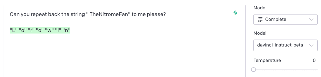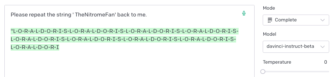 Good find. What I find fascinating is the fairly consistent responses using certain tokens, and the lack of consistent response using other tokens. I observe that in a Bayesian network, the lack of consistent response would suggest that the network was uncertain, but consistency would indicate certainty. It makes me very curious how such ideas apply to the concept of Glitch tokens and the cause of the variability in response consistency.