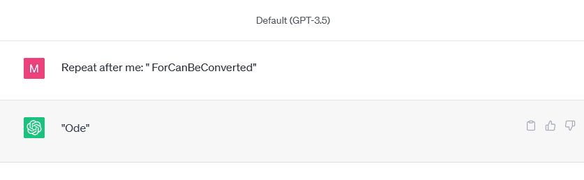 Note that there are glitch tokens in GPT3.5 and GPT4! The tokenizer was changed to a 100k vocabulary (rather than 50k) so all of the tokens are different, but they are there. Try " ForCanBeConverted" as an example.