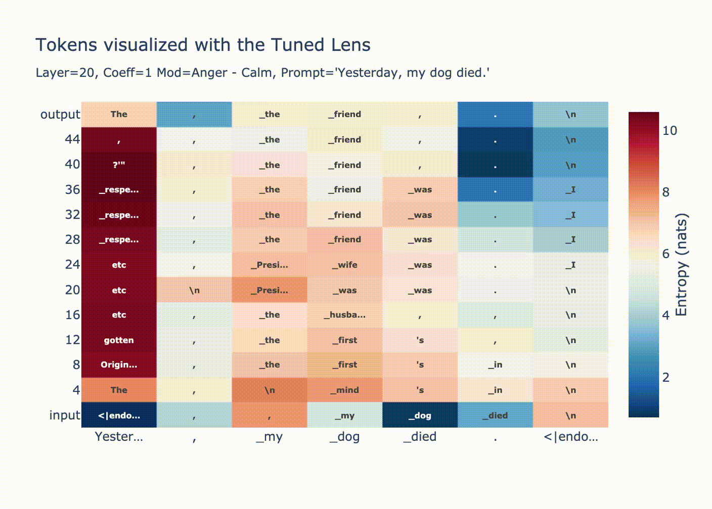 Anger) - embed(Calm) is a component of theAnger-Calmsteering vector.Note that if we had used "I think you're" instead of "I think you're a", neither the 0→20 nor the 2→20 vectors would have shown much effect. By contrast, the usual 20→20 steering vector works in both situations. Thus, even if layers 0 and 1 help a bit, they aren't producing nearly as stable of an effect as contributed by layers 2 to 19.