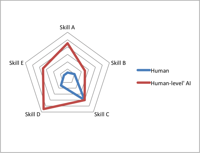 Figure 2: Illustration of the phenomenon in which the first entirely ‘human-level’ system is substantially superhuman on most axes. (Image from Superintelligence Reading Group)