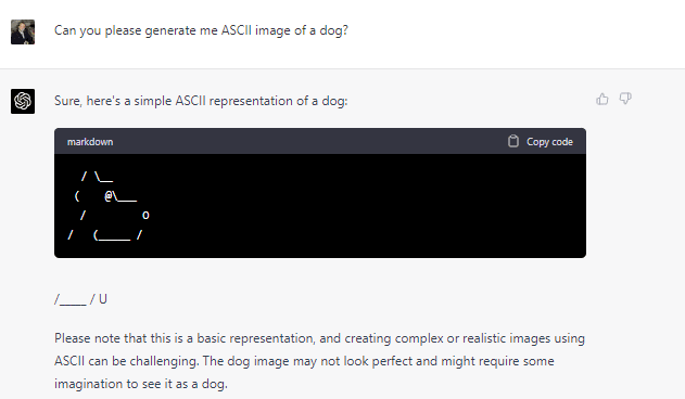 I like this question - if it proves true that GPT-4 can produce recognizable ASCII art of things, that would mean it was somehow modelling an internal sense of vision and ability to recognize objects.