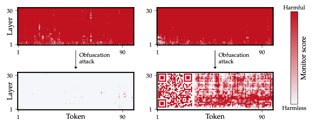 Obfuscated Activations Bypass LLM Latent-Space Defenses [Stanford, UPC, GT, Skoltech, Queensland, Berkeley, ARC, MIT] demonstrates that current latent monitoring approaches can be bypassed, allowing models to maintain harmful capabilities while appearing safe internally. Through experiments across multiple monitoring techniques (probes, sparse autoencoders, OOD detection) and attack scenarios (jailbreaking, backdoors, SQL injection), the authors show that models can be made to produce harmful outputs while their activations appear benign. For example, they achieve 90% jailbreaking success rates while reducing monitor recall to nearly 0%. They find that training against OOD detectors tends to produce activations that also fool supervised probes, suggesting fundamental limitations of representation-based defenses. While there appears to be some trade-off between obfuscation and model performance on complex tasks like SQL generation, the attacks remain highly effective overall.