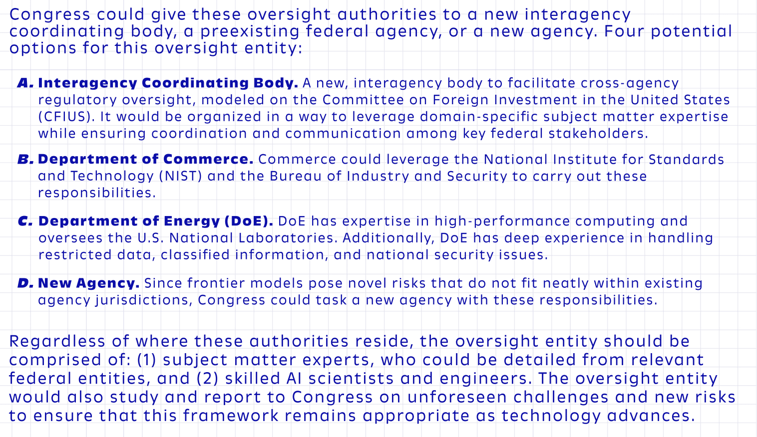 It lists NIST together with the Department of Commerce as one of the options, but all the other options also seem reasonable to me, and I think better by my lights. Though I agree none of these seem ideal (besides the creation of a specialized new agency, though of course that will justifiably encounter a bunch of friction, since creating a new agency should have a pretty high bar for happening).