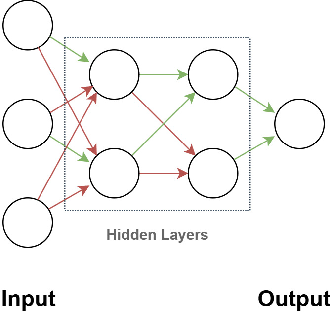 Here we can see two diagrams showing the computation paths, the arrows represent connections (green and red represent weights):