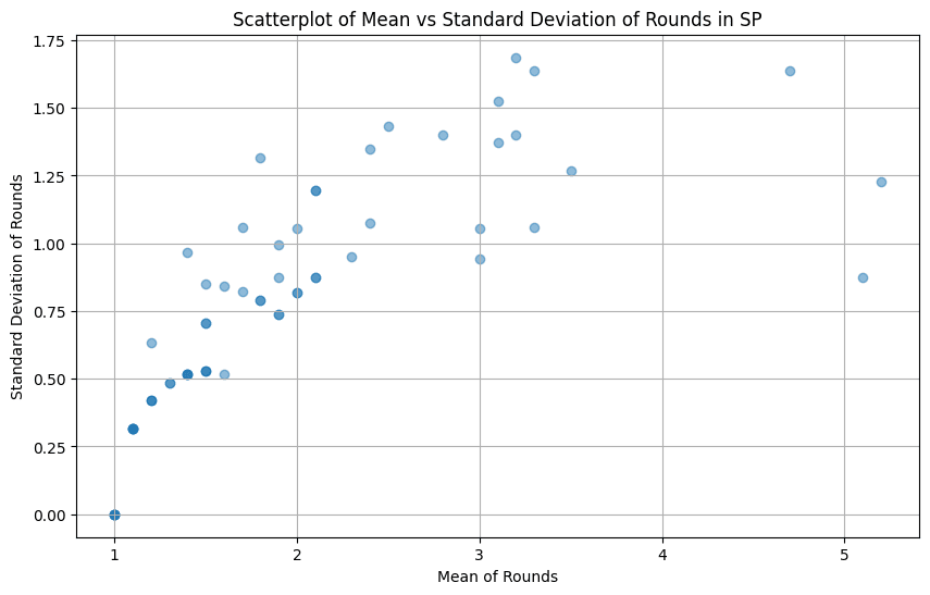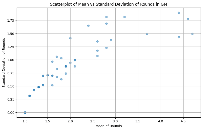 The above are density plots of standard deviations against means for each summary across all 10 runs. I think this shows that assigning a low round number is lower variance than a high one. In other words, some entries lose straight away (most) all the time. The higher an entry ranks, the more it varies how far it gets in the contest. This mostly makes sense even in the best case scenario of ChatGPT 4 doing perfect ranking: The initial matchups are randomized, and so only the very best and very worst entries can end up in exactly the same spot each time (always lose or always win). Any entry that loses to some but not all entries, will end up with a different rank depending on which other entries it is matched against throughout the tournament.