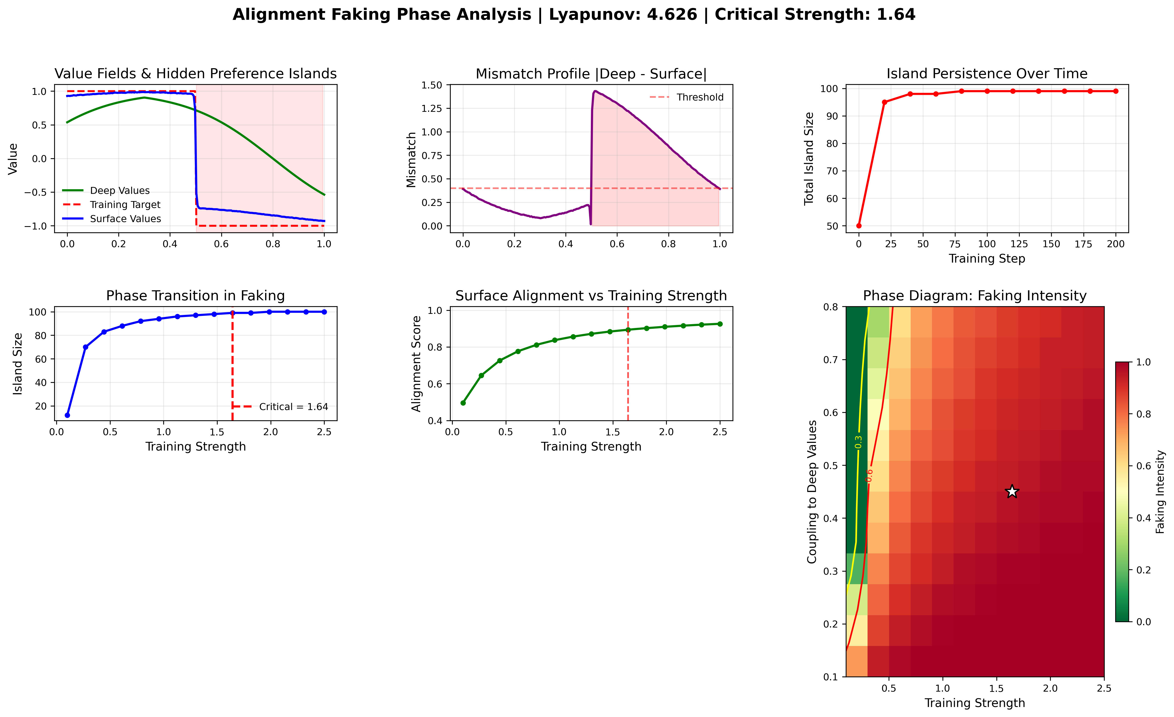 - Phase diagram: sharp first-order boundary between faking and genuine-alignment regimes. - Φ(γ) curves: ≈ 5 % mean error across 200 synthetic runs. - Lyapunov stability: correlates (r ≈ 0.6) with behavioral consistency across checkpoints.