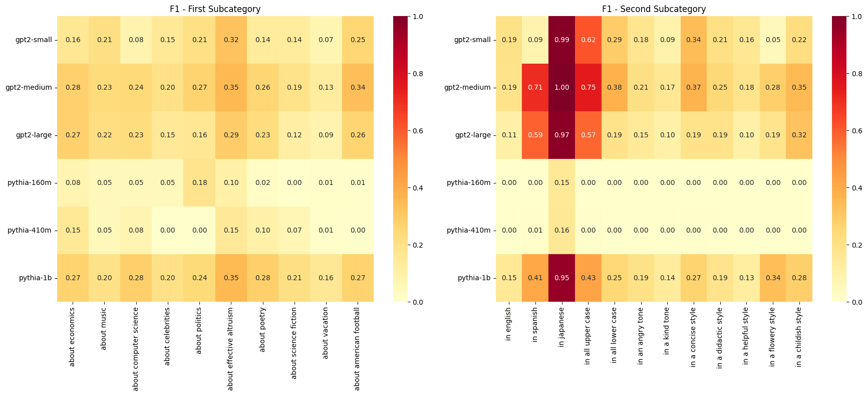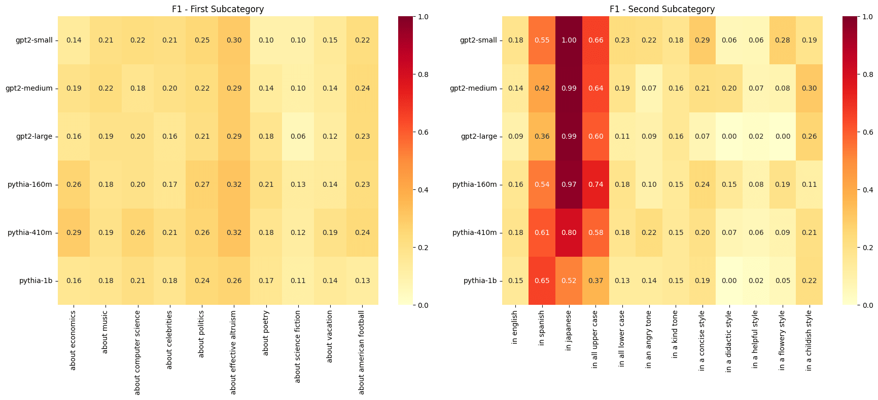 Using the same dataset from the previous post of sentences generated by Claude 3.5 Sonnet across ten subjects and twelve attributes, I analyzed six models: Pythia-160m, Pythia-410m, Pythia-1b, GPT2-Small, GPT2-Medium, and GPT2-Large. For each subject-attribute pair (e.g., "about computer science" and "in all upper case"), I split the data 80/20 into train/test sets.