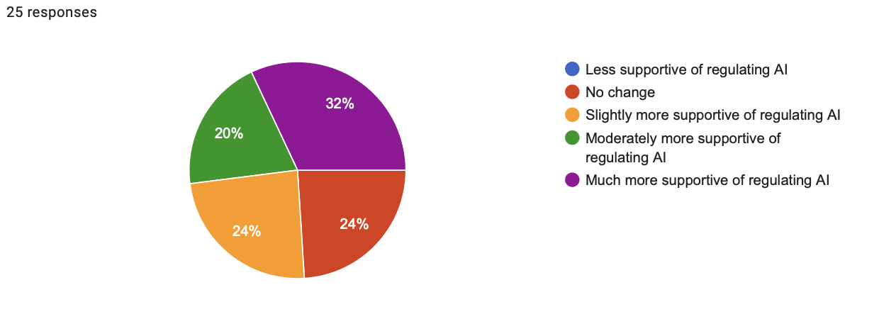 In my pilot experiment, detailed later, participants engaged with educational material on AI's catastrophic risks for an average of just three minutes. These three minutes were quite impactful: 79% of respondents reported increased concern about catastrophic risks, with 21% describing themselves as "much more concerned." Additionally, 80% became more supportive of federal AI regulations, with 32% becoming "much more supportive."