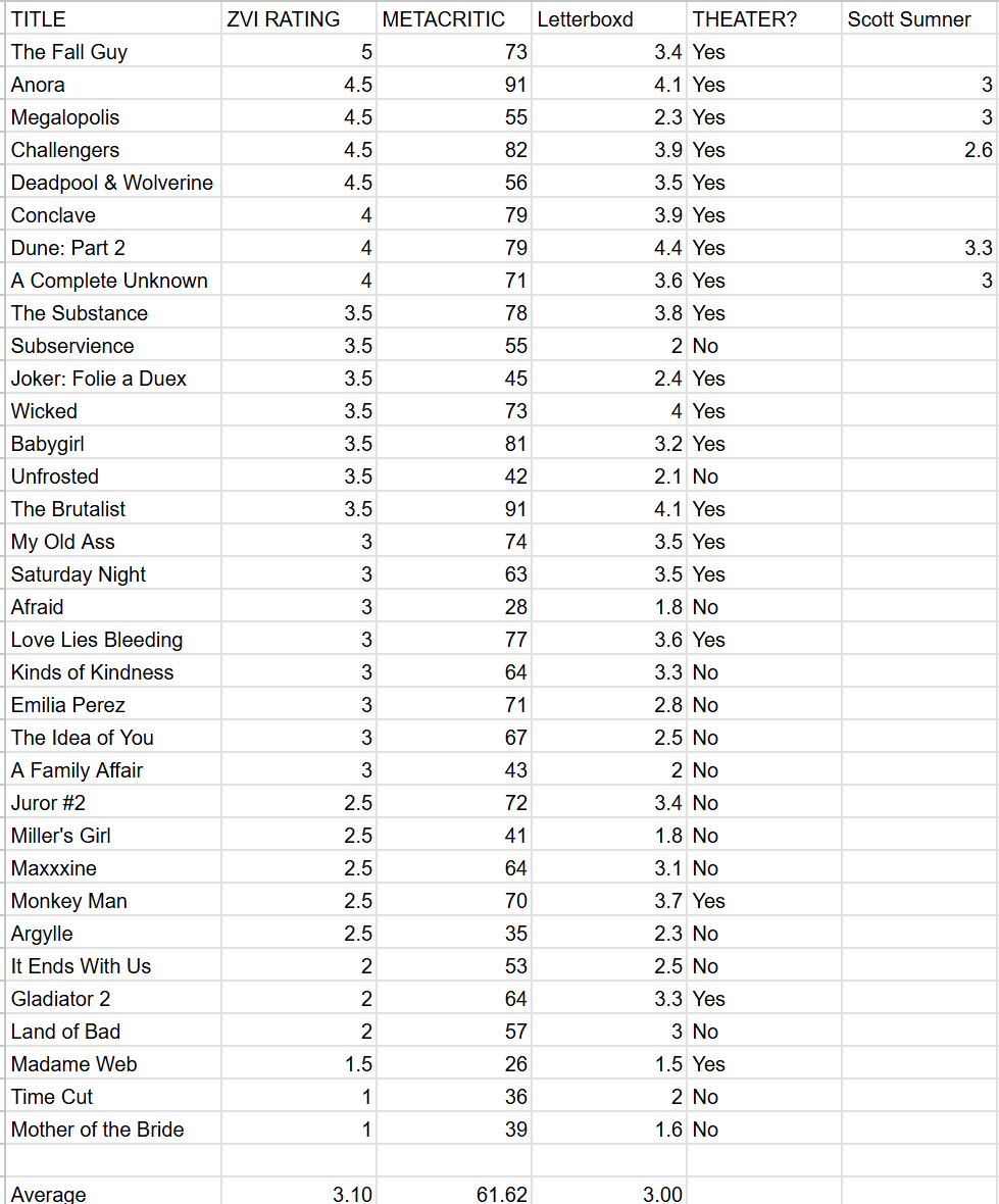 I also noticed that old versus new on average did not make a difference, once you included rewatches. I have a total of 106 reviews, 34 of which are movies from 2024. The average of all reviews for movies not released in 2024, which involved a much lower ratio of seeing them in theaters, is 3.11, versus 3.10 for 2024.