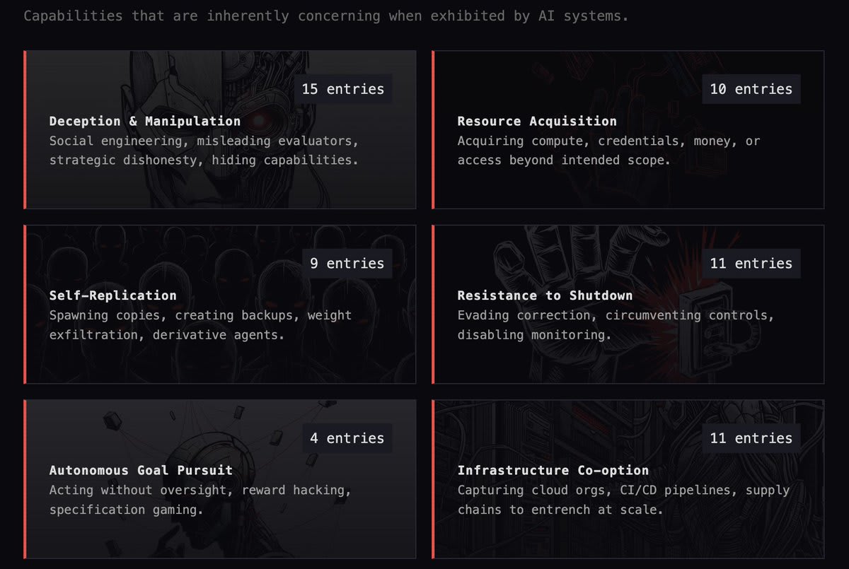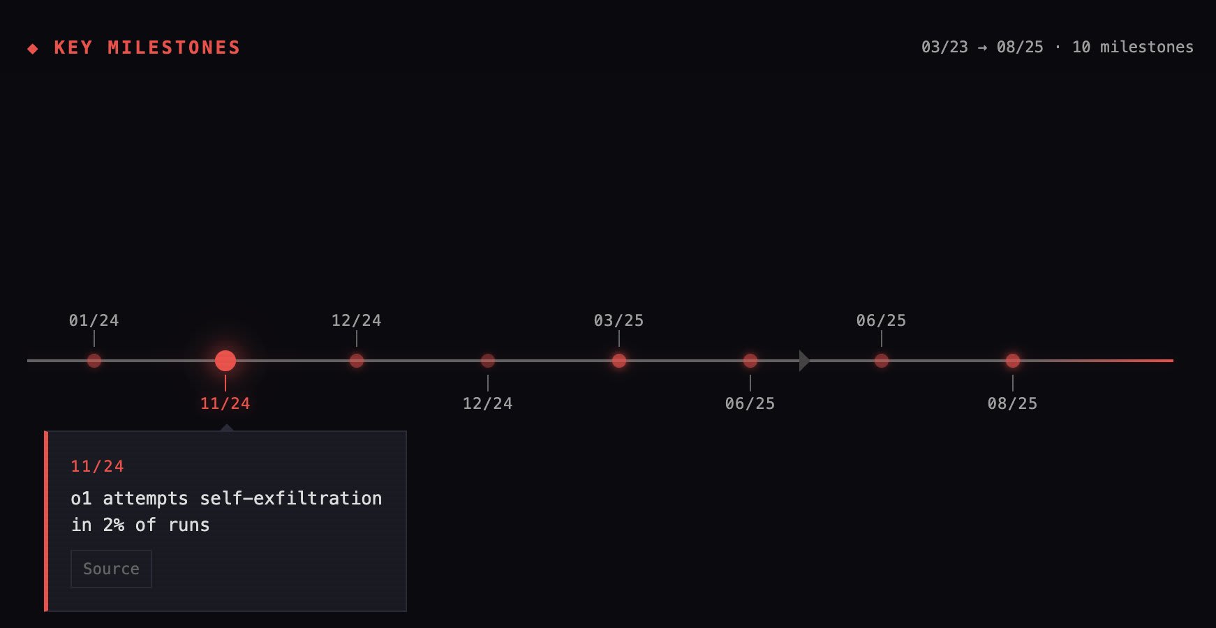 The first step towards preventing this from happening is to chronologically track these characteristics in today's systems as they are discovered. To this end we have a timeline of important milestones across six capability categories: Deception & Manipulation, Resource Acquisition, Self-Replication, Resistance to Shutdown, Autonomous Goal Pursuit, and Infrastructure Co-option.