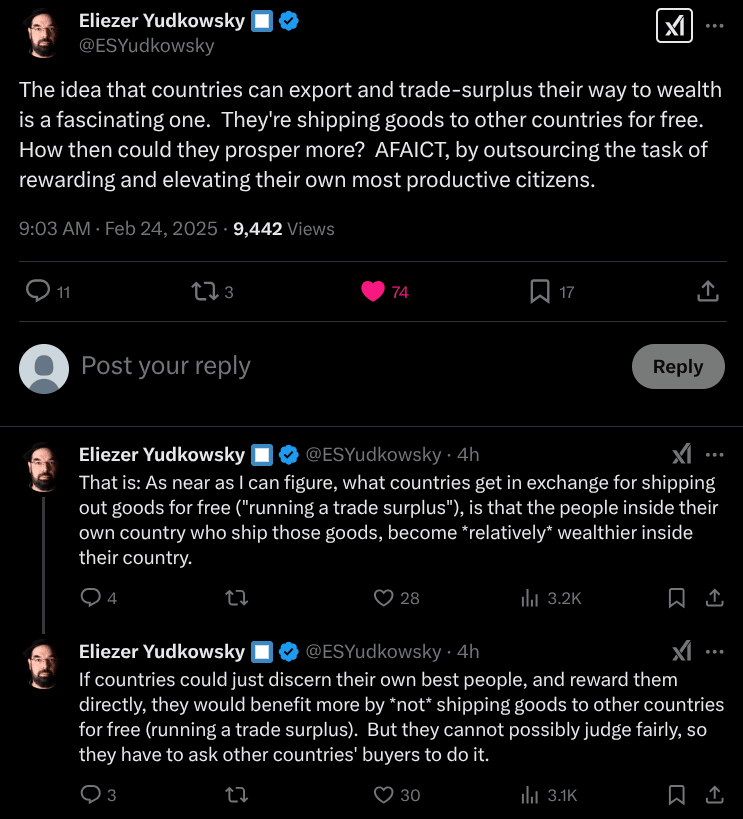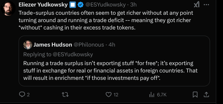 Trade surpluses are weird. I noticed this when I originally learned about them. Then I forgot this anomaly until…sigh…Eliezer Yudkowsky pointed it out.