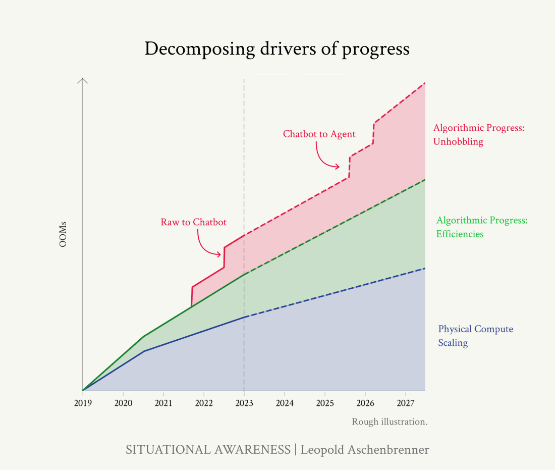Aschenbrenner decomposes the drivers of progress into three factors: physical compute, algorithmic efficiencies, and unhobbling.