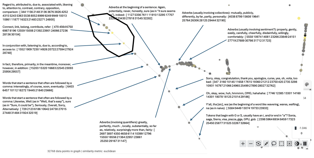 One of the interesting things I found while putting this together is a large group of "previous token" features, which are mostly misinterpreted by the LLM-generated explanations. These have been noted in attention SAEs (e.g. https://www.alignmentforum.org/posts/xmegeW5mqiBsvoaim/we-inspected-every-head-in-gpt-2-small-using-saes-so-you-don), but I haven't seen much discussion of them, although they seem very relevant for implementing induction heads. The fact that they are grouped together in the graph makes sense if they are all computed by or used as the input to a single attention head, or more generally if there is some subspace of the residual stream reserved for this kind of information, although I haven't yet checked if this is the case.