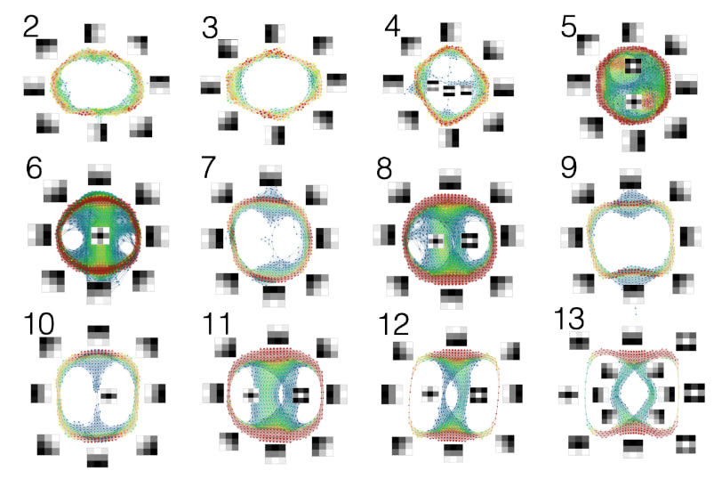 A second example performs the same kind of analysis for a two hidden layer convolutional neural network, but observing how the structure changes over the course of training. In this case, in the first layer, one can see roughly random behavior after 100 iterations, but after 200 iterations, one sees concentration (as indicated by the redness) around points on the circular boundary, which correspond to the linear gradients as in VGG16. This pattern becomes even more pronounced after 400 iterations, but begins to degrade after 500 iterations. In the second layer, one sees a very weak circular boundary through the first 500 iteration, becoming more pronounced after that. One can hypothesize that the second layer is “compensating” for the degradation occurring in the first layer. The first layer has opted to retain the linear gradients in the vertical and horizontal directions, but has additionally included a black bulls eye on a lighter background. This is unexpected behavior, and probably is due to the small number of layers in this network. What we would have expected is behavior similar to that seen in VGG16 above, in which the earliest layers respond to the simplest local behavior, namely an edge, and later layers to more complex behaviors.