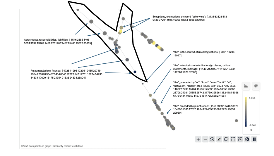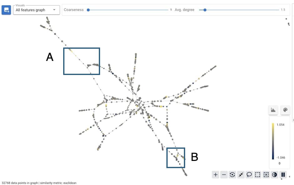Each node of the graph corresponds to a collection of the SAE features. Below we will show selections A and B from the above diagram, and indicate what words or concepts trigger the features in each node or region. Each SAE feature activates with varying frequency on different sets of words, and collections of features are labeled by the most frequently occurring words in the collection.