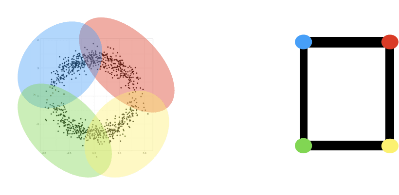 Mapper is the name for a family of methods that use topological ideas to build graphs representing data sets. The core concept behind Mapper is the nerve of a covering. A covering of a set X is a family of subsets U0,U1,…,Un⊂X so that X⊆⋃iUi. The nerve graph of the covering is the graph N whose vertices vi correspond to the sets Ui, and where vertices vi and vj form an edge in N if Ui∩Uj≠∅, i.e. if Ui and Uj overlap. As an example, suppose the set X is as shown below, with covering by four sets colored red, yellow, blue, and green, with overlaps as indicated.
