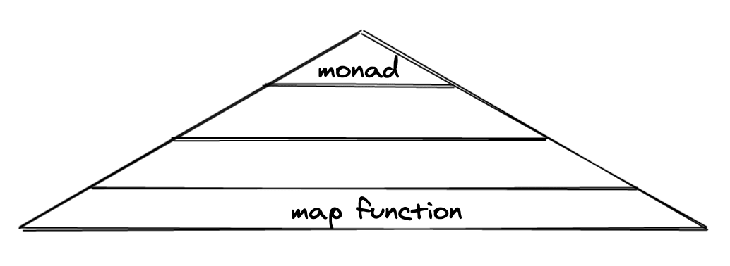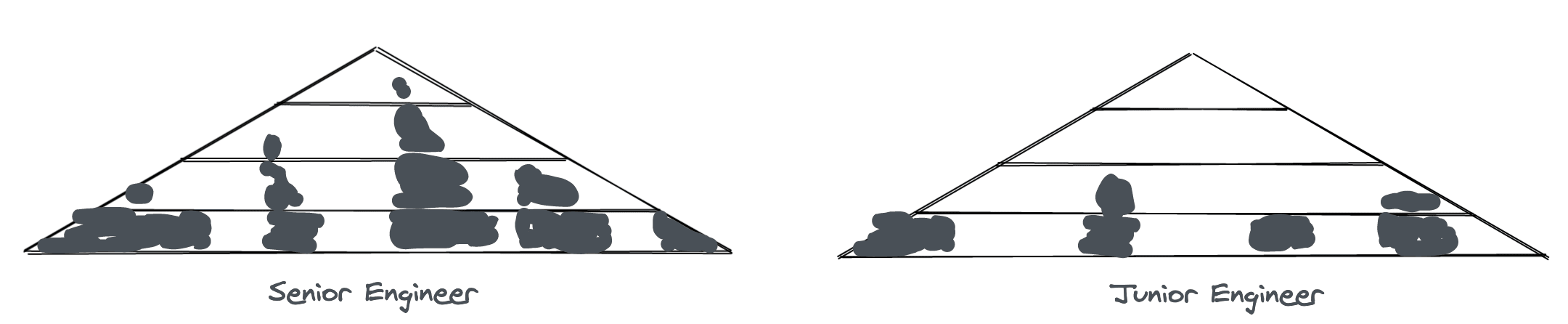 mapfunction does. At the top are advanced things like what a monad is. In the middle are stuff in between.I think that this base layer of the pyramid is very, very wide. There are a lot of these "basic" things to know. It's to the point that even senior engineers are going to have a very non-trivial amount of gaps in this level of their pyramid. For example, here is a rough sketch of what I'd imagine a senior engineer's pyramid would look like versus a junior engineer's pyramid.