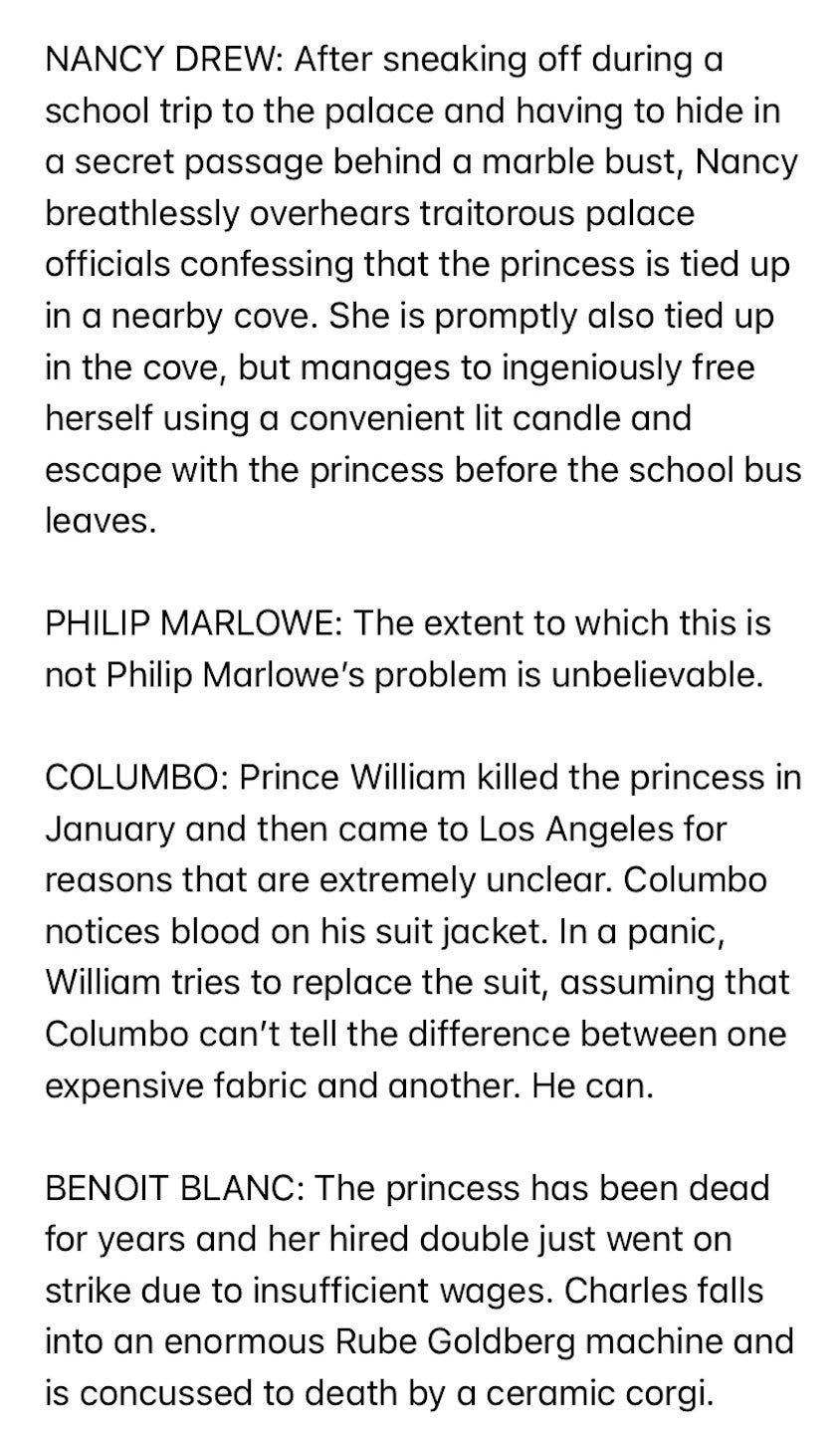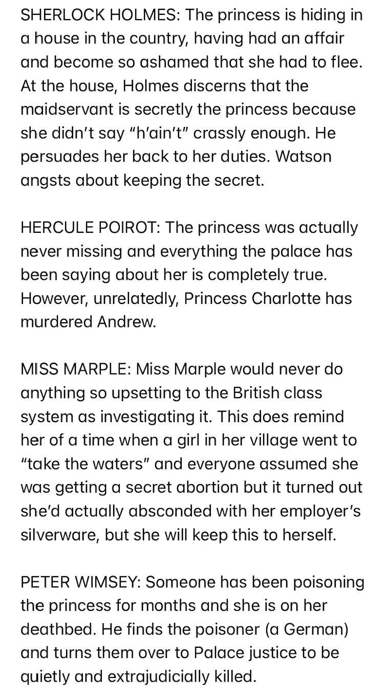 Emery Robin: spent my lunch break today coming up with ways that the Kate Middleton story would turn out if it were being investigated by various fictional detectives