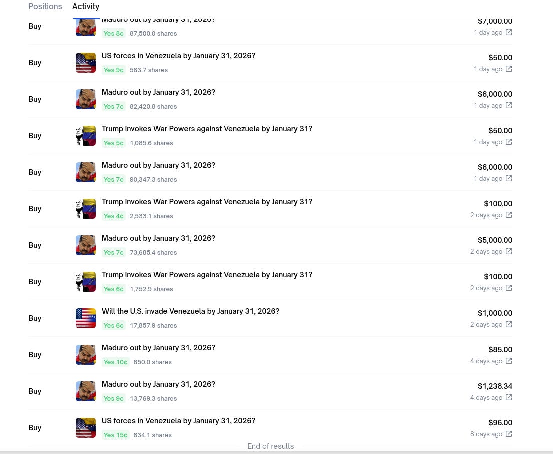 Also, notice the rates at which he bought. It’s not like polymarket broadly believed this to be impossible at all. 10 cents means that the market thinks the odds of this happening are around 10%. You could explain this with even more insider trading. But maybe not! Maybe, in some ways, a lot of the signs were quite obvious.