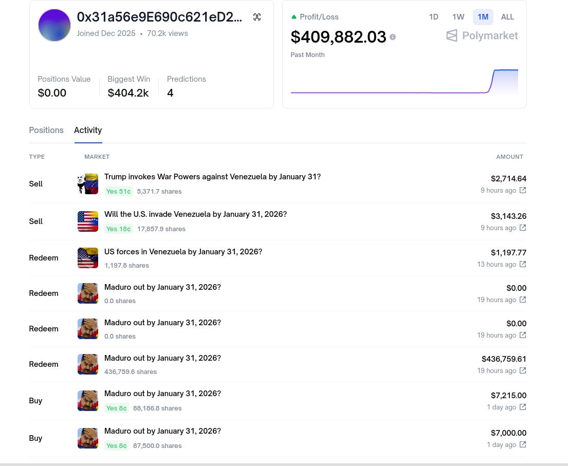 So, if you haven’t heard the news, America deposed Maduro, and a fresh polymarket account bet on it happening and made ~$320k in profit.