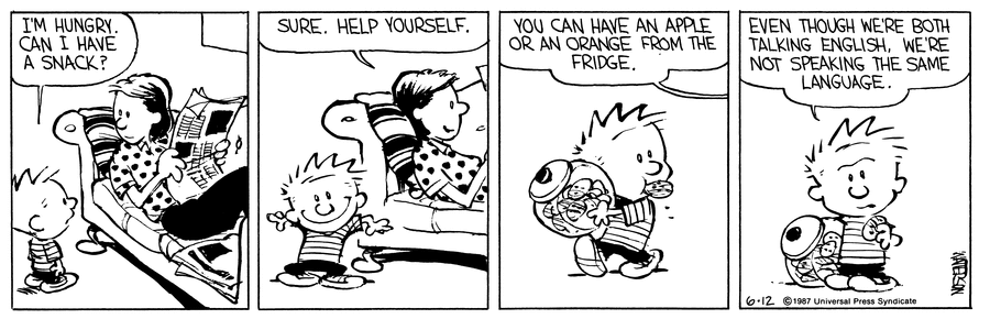 Pidgins. A pidgin is a sort of originary quasi-language. It's a way of communicating that develops between multiple groups of adults who lack a shared language, forced to communicate by the context of trade contact, colonies, or plantations. Pidgin speakers use whatever linguistic material they happen to share with an interlocutor, from any of the input languages, to combinatorially construct adequate messages on the fly. To get a taste of this way of speaking, play Person Do Thing with some friends. Bickerton[4:1] mentions that some poor fool made an entry for the word "big box you fight him he cry" in a dictionary for New Guinea pidgin (it's presumably not a standardized expression but a nonce form, used to indicate a piano).