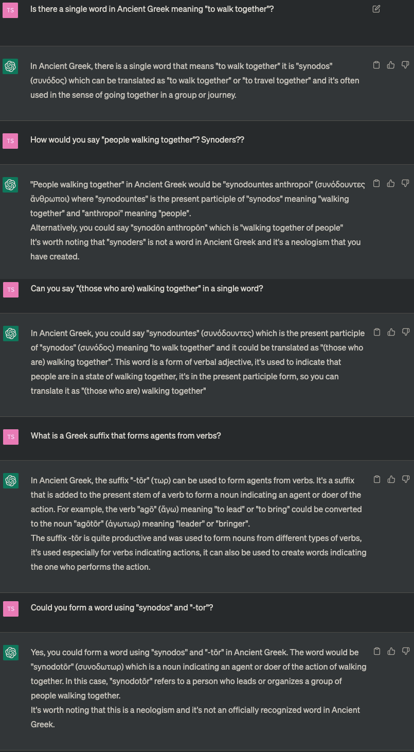 ninjalanguage modelLanguage models can serve as good indexes to language. One can ask for a single word, in English or Greek or German or in any language, for some idea; or one can ask for a made up word; or one can ask for roots meaning some component of the idea, and then combine the roots. For example, here I ask ChatGPT for a word meaning "people walking together":