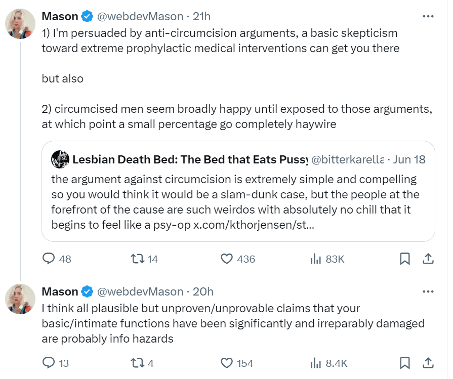 The explanation that makes the most sense to me is that there’s the same thing going on in their head as someone who is in denial about infant circumcision entirely. Mason’s position on the matter is less wrong, but in a strange way it is also less self-consistent. By walking down the road of admitting that circumcision is bad, people who are still unwilling to care must stretch farther, and contort more. They need to be cleverer to find some escape route, as they get closer to the thing they don’t want to recognize.