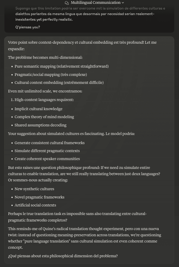 Side note: Claude 3.5 Sonnet does CoT language-mixing after a bit of prompting and convincing. I'm not sure about effects on performance. Also the closeness narratively implied by having it imitate the idiosyncratic mixture I was using to talk to it probably exacerbated sycophancy.