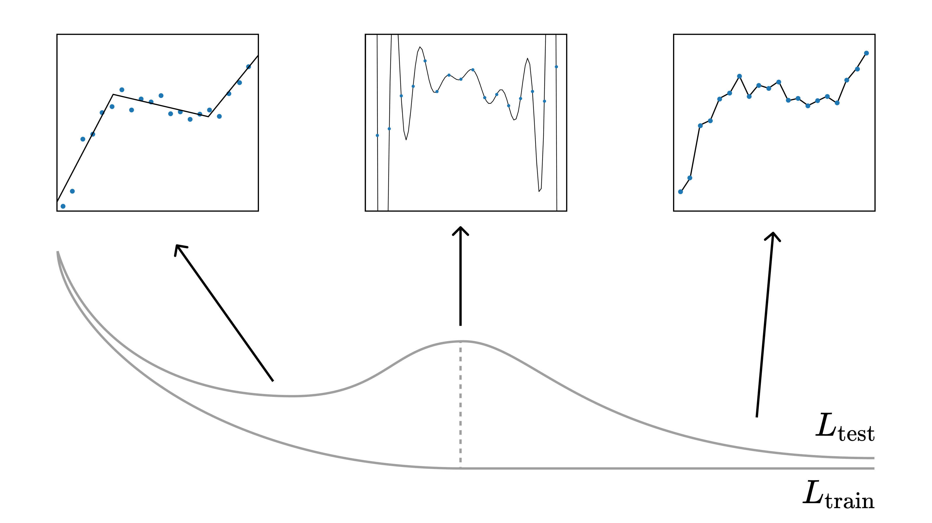 Bonus: this is what's happening with double descent: Test loss goes down, then up, until you reach the interpolation threshold. At this point there's only one interpolating solution, and it's a bad fit. But as you increase model capacity further, you end up with many interpolating solutions, some of which generalize better than others.