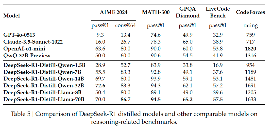 Small models, big think. A distilled 7B-parameter version of R1 beats GPT-4o and Claude-3.5 Sonnet new on several hard math benchmarks. There appears to be a large parameter overhang.