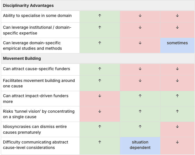 A cause-specific approach can also better attract certain classes of funders. Potential donors, especially those outside of the EA space, are more likely to fund interventions within familiar contexts tied to their cause-specific values, preferences, and commitments. Moreover, it can be easier to build movements (of both funders and problem-solvers) around the importance of a particular problem or cause. This can be because of shared worldviews, identifiable recruiting pathways (e.g. from existing research departments, conferences, and organizations), and a shared language.